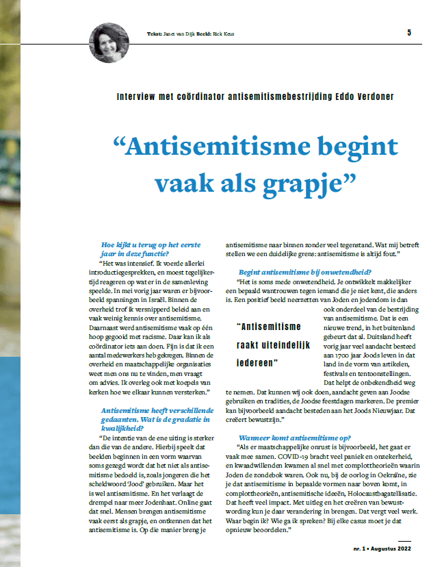“Het was intensief. Ik voerde allerlei introductiegesprekken, en moest tegelijkertijd reageren op wat er in de samenleving speelde. In mei vorig jaar waren er bijvoorbeeld spanningen in Israël. Binnen de overheid trof ik versnipperd beleid aan en vaak weinig kennis over antisemitisme. Daarnaast werd antisemitisme vaak op één hoop gegooid met racisme. Daar kan ik als coördinator iets aan doen. Fijn is dat ik een aantal medewerkers heb gekregen. Binnen de overheid en maatschappelijke organisaties weet men ons nu te vinden, men vraagt om advies. Ik overleg ook met koepels van kerken hoe we elkaar kunnen versterken.”